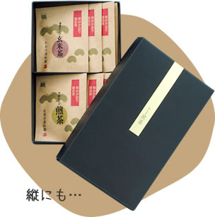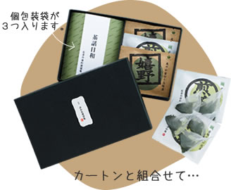 ティーバッグ 個包装袋(w100×H120mm)が6袋入るギフト箱とティーバック袋が3袋入るカートン。